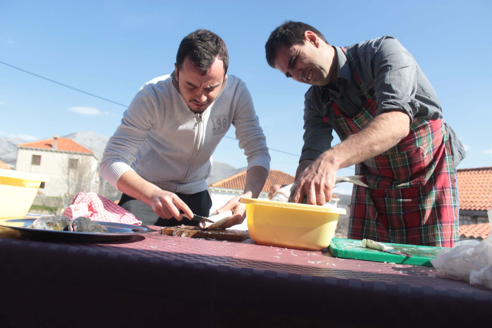On arrival, after introduce by our host, we’ll cheer with liqueur for ladies, rakija for man and cold platter of prosciutto and cheese. Now, get ready to role up your sleeves and start preparing fire for barbecue and peka meal. For best flavor we use wood of grapevine and olives. While some can slice organic vegetables; tomato, mangold, potato, onion for salad and side dish, others will clean the fish and spice it with Adriatic salt from town Ston and rosemary. Your host, who is a great expert for Mediterranean cuisine, will reveal you all secrets of how to make best grilled fish, traditional Croatian food ‘peka’ and ‘al dente’ prepared vegetable. In this rural ambient you’ll taste 3 finest examples of red wines by local vintner. Proprietress will teach you how to prepare traditional sweet – ‘rosata’. Finally, it’s time to sit down and enjoy delicious lunch you have prepared! Final flavor is given by domestic extra virgin olive oil. Meal will be paired with fine selection of red or white wines from region while those who prefer something else will be offered by local bears, domestic juices and other soft drinks. Enjoy delicious lunch and beautiful view on Dubrovnik Riviera!